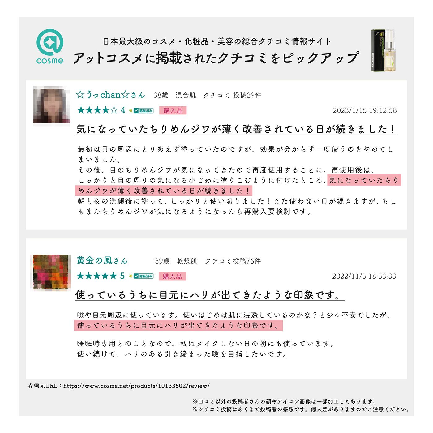 合成香料・合成着色料・鉱物油・エタノールも不使用です。ヒアルロン酸を50%以上配合していますので、どのシーズンも乾燥しがちな目元の周りのお肌もふっくらにしてくれる保湿効果が期待できます。